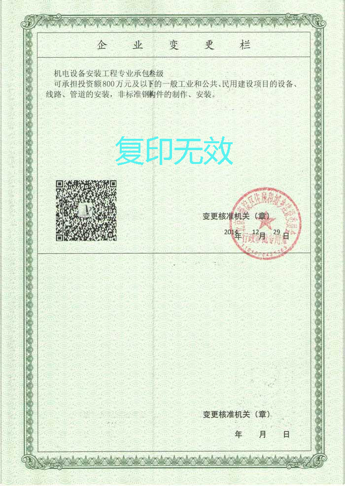 我公司于2014年12月獲得機電設(shè)備安裝工程專業(yè)承包三級資質(zhì)。
